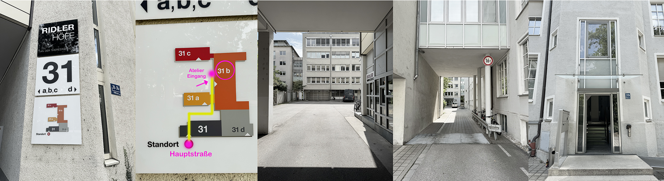 Betreten Sie das Gelände. Gehen Sie ein kurzes Stück geradeaus und biegen Sie dann rechts ab. Folgen Sie dem Weg, bis Sie links abbiegen können. Gehen Sie diesen Gang bis zum Ende und biegen Sie dort erneut rechts ab. Der Eingang zu 31b ist dann direkt vor Ihnen.“